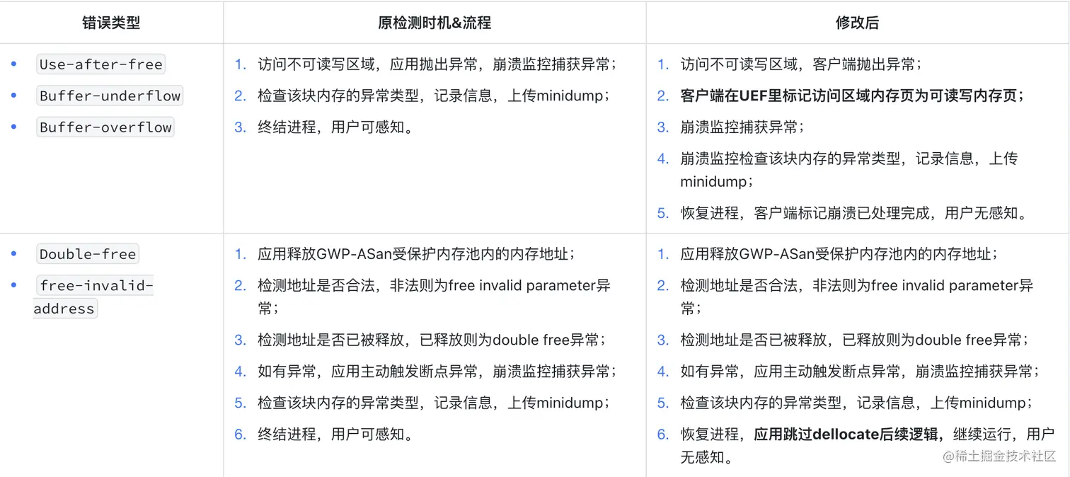 GWP-ASan检测到异常后,会主动崩溃导致客户端进程退出,给用户带来了不良体验。无崩溃的GWP-ASan检测到异常后,再将对应内存页标注为可读写的(如为use-after-free/buffer-underflow/buffer-overflow),仅生成上传崩溃报告,不主动终结进程,客户端标注异常已解决。用户无感知,程序继续运行。需要注意的是,客户端在UEF里标记访问区域内存页为可读写内存页可能影响后续的GWP-ASan检测。
