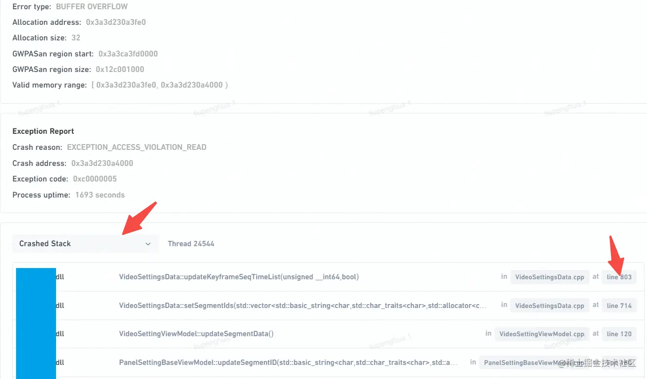 可见GWP-ASan告知我们是堆溢出,并且替我们定位到了第一现场。 我们只要查看ViedoSettingsData.cpp803行周围的代码,就能迅速定位问题。也就是上述代码的 auto& seg = m_segmentPtrs[index];这段代码导致了溢出。再查看上一层函数,发现当IF_CONTINUE(segmentPtr == nullptr) 时,必然会出现堆越界。