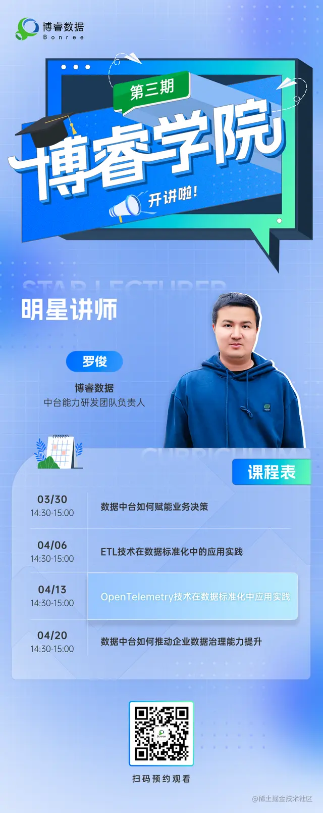 本周四14:30,博睿数据中台能力研发团队负责人罗俊将带来【数据集成系列公开课】第三讲:【OpenTelemetry技术在数据标准化中的应用实践】 ,为大家带来数据标准化中OpenTelemetry技术的实操经验与深入思考,欢迎预约收看。