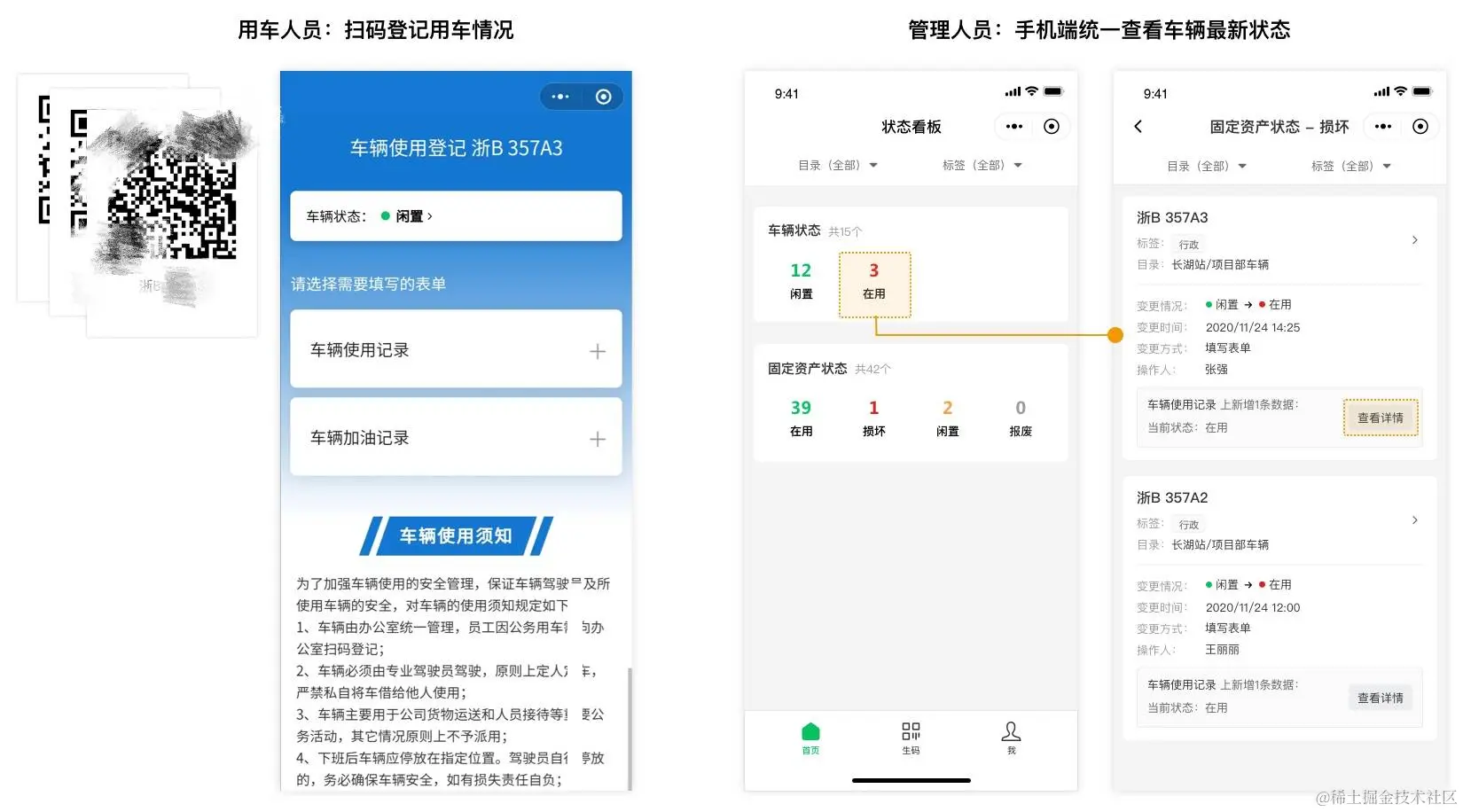 使用二维码对车辆进行管理,扫码即可实现车辆出车前的日常点检、故障上报、维修登记,以及记录车辆使用情况,加油情况等等,代替纸质记录单,所有数据将在后台汇总,方便了解所有车辆的运行情况,计算车辆使用成本。以下是利用二维码对车辆进行管理的应用优势: