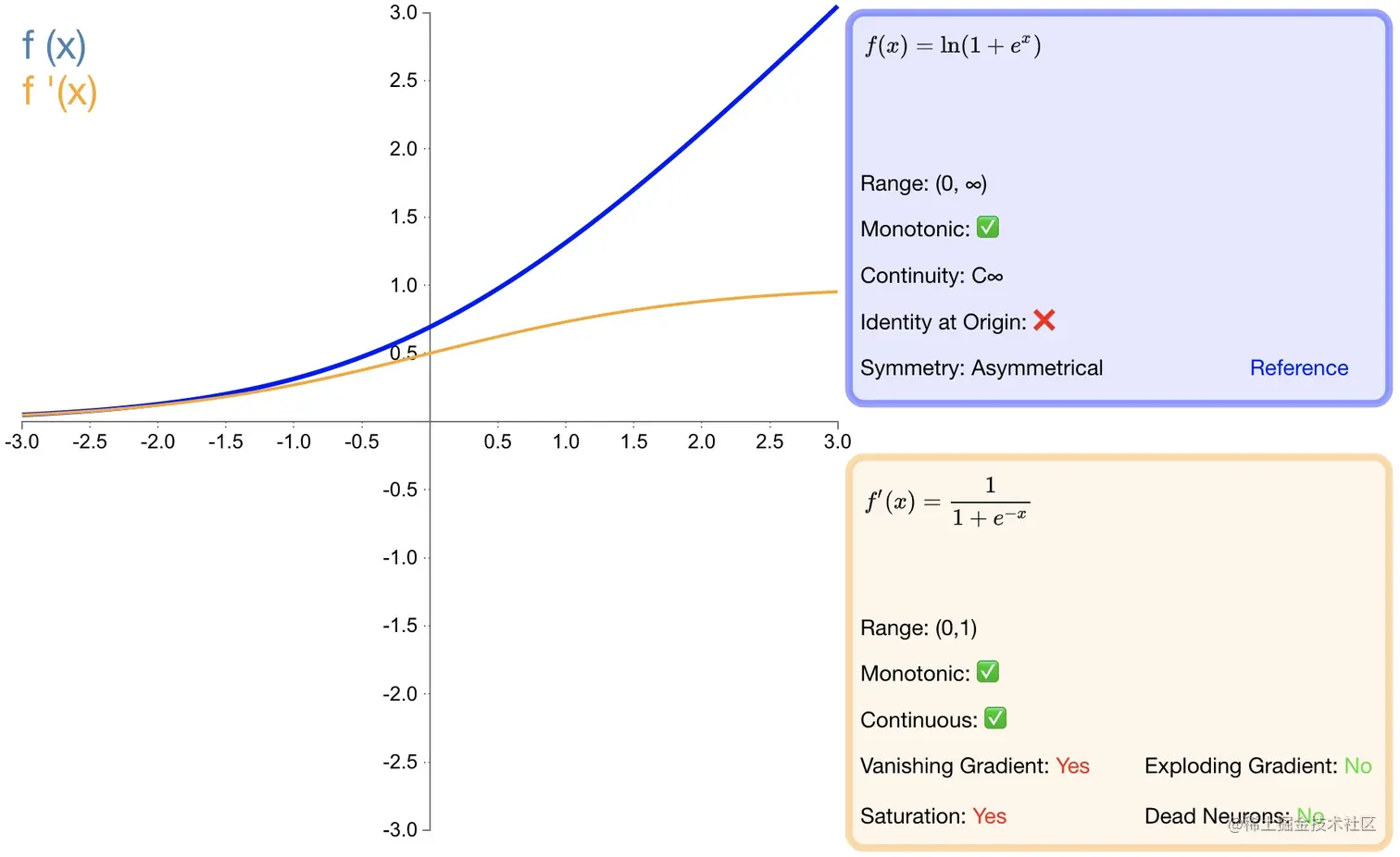 与 relu不同,softplus的导数是连续的、非零的,无处不在,从而防止出现死神经元。