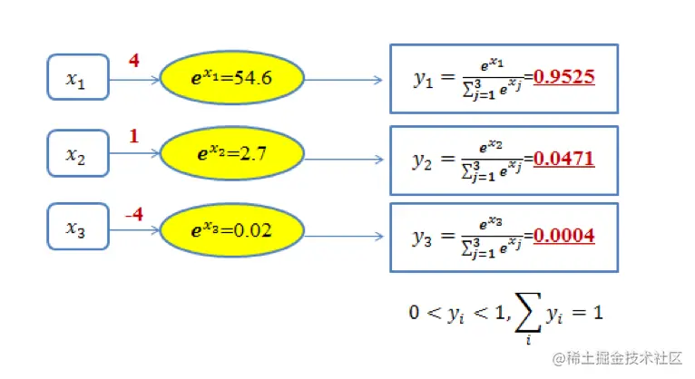 也可以从如下另外一个角度来理解图 1 中的内容:给定某个输入数据,可得到其分类为三个类别的初始结果,分别用 x1、x2和 x3来表示。这三个初始分类结果分别是 4、1和-4。通过 Softmax 函数,得到了三个类别分类任务中以概率表示的更好的分类结果,即分别以 95.25%、4.71%和0.04% 归属于类别1、类别2 和类别3。显然,基于这样的概率值,可判断输入数据属于第一类。可见,通过使用 Softmax 函数,可求取输入数据在所有类别上的概率分布。