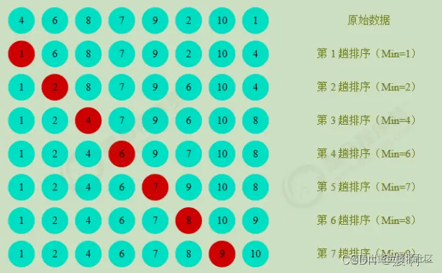 1.每一次遍历的过程中,都假定第一个索引处的元素是最小值,和其他索引处的值依次进行比较,如果当前索引处的值大于其他某个索引处的值,则假定其他某个索引处的值为最小值,最后可以找到最小值所在的索引