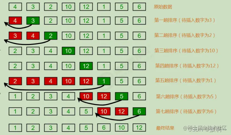 - 插入排序:比较是从有序序列的末尾开始,也就是想要插入的元素和已经有序的最大者开始比起,如果比它大则直接插入在其后面,否则一直往前找直到找到它该插入的位置。如果碰见一个和插入元素相等的,那么把要插入的元素放在相等 元素的后面。所以,相等元素的前后顺序没有改变,从原无序序列出去的顺序就是排好序后的顺序,所以插入排序是稳定的。