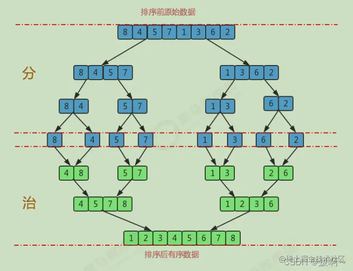 - 归并排序:归并排序在归并的过程中,只有arr[i]<arr[i+1]的时候才会交换位置,如果两个元素相等则不会交换位置,所以它并不会破坏稳定性,归并排序是稳定的。