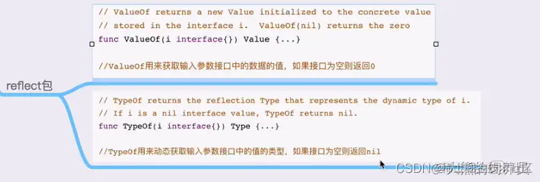 先看个导图吧,reflect包包含了两种方法valueof和typeof。其中valueof用来获取输入参数接口中的数据的值,如果接口为空则返回0;typeof用来动态获取输入参数接口中的值的类型,如果接口为空则返回nil。