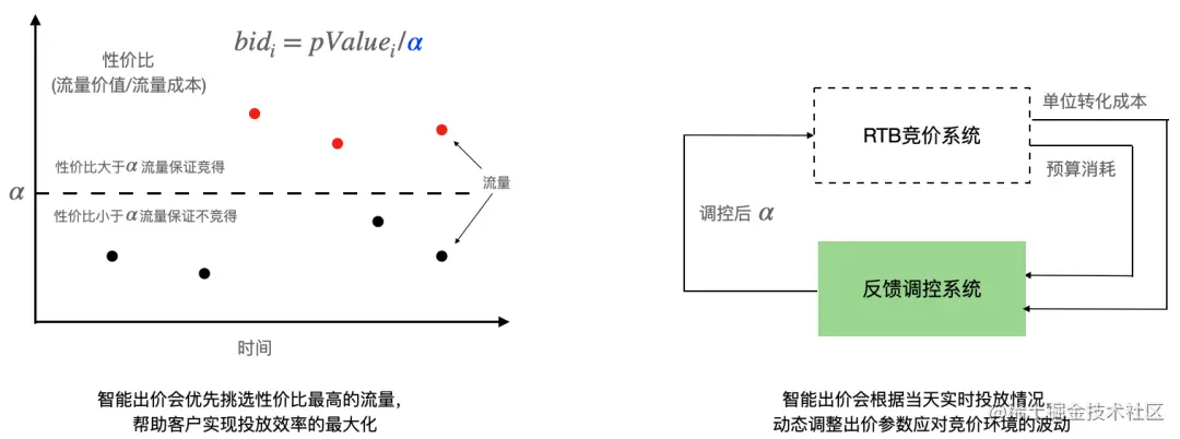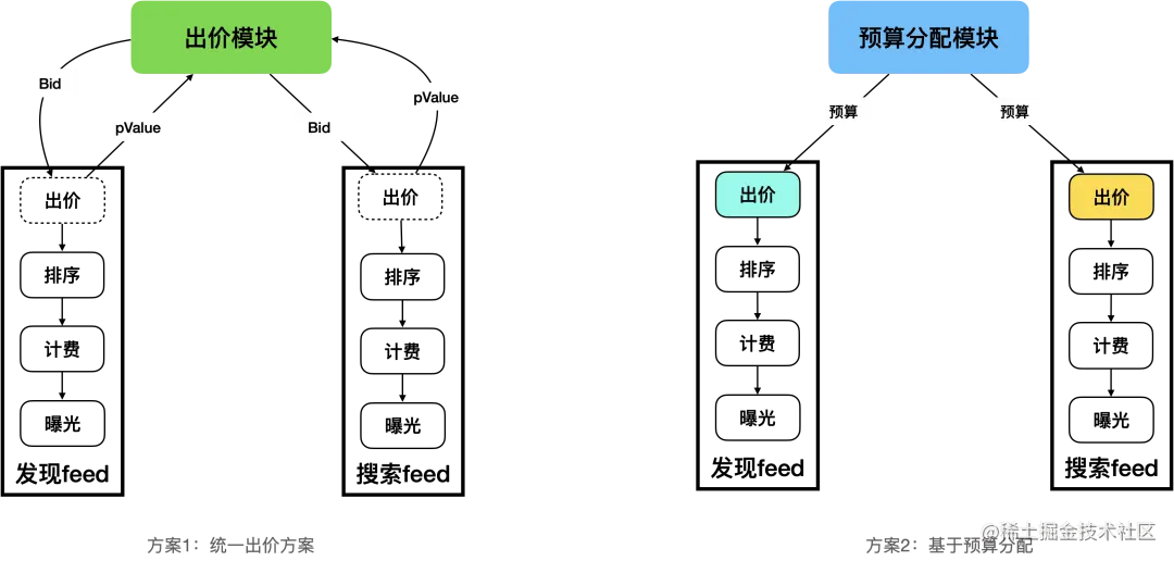 1. 统一的智能出价模块直接进行流量粒度出价(Bid),不同场景提供流量以及流量价值预估分(pValue),如下左图所示。该方案能实时考虑计划的整体预算进行调控,架构清晰,但对系统要求较高,两个场景的投放系统耦合更重,转化率预估的能力也需要对齐。