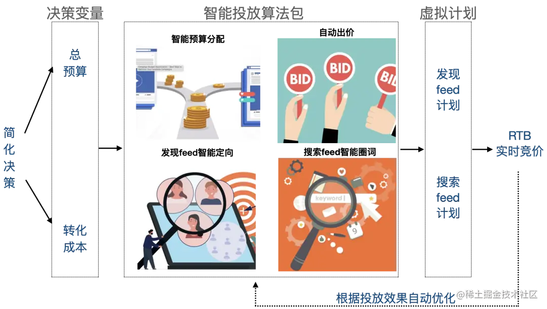 在实时竞价广告业务中,平台提供给客户的投放能力对其投放效果有显著影响。在传统的点击出价方式中,如何设定合理的出价以平衡拿量和目标成本对于客户来说一直是个难题,这使得各场景的投放门槛一直居高不下。