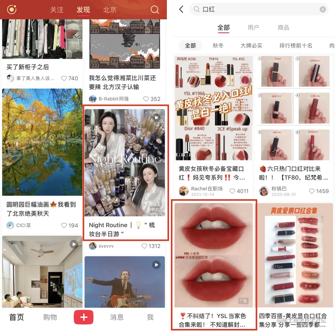小红书是一个生活内容社区,更是一个消费决策平台。商家想在小红书内更多地吸引用户消费时,有多种渠道可供选择(下图从左到右依次为“发现 feed”、“搜索 feed”中的广告内容),多渠道的广告投放可以更大范围、更高概率地触达潜在用户,从而达到推广商品、服务消费者的目的。