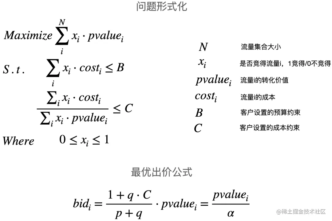 关于智能出价的建模,我们把问题抽象成带约束的最优化问题,并基于线性规划的 primal-dual 方法把原问题转化到对偶空间进行求解,得到最优的出价公式。我们把智能出价问题做以下形式化,并得到最优出价公式: