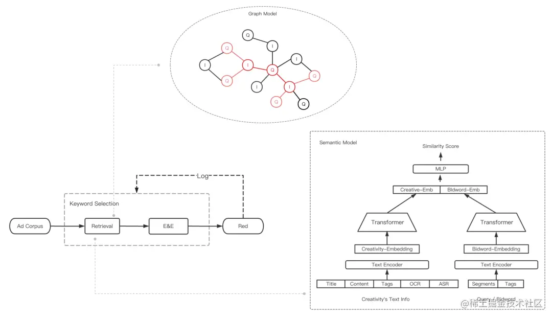 智能圈词算法的工作原理如下图所示。我们采用了经典的“召回+优选”两段式架构,在召回阶段主要通过内容理解和用户行为建模两种方式结合挖掘潜在关键词。前者对广告物料内容做深入理解分析,利用“核心词提取”、“语义理解”、“多模态表示学习”等技术,提升物料信息抽取的有效性,并以此挖掘高精准关键词;后者则充分利用平台内的用户行为信息,借助图神经网络强大的特征提取和关系推理能力,发现更具意图扩展性的关键词。