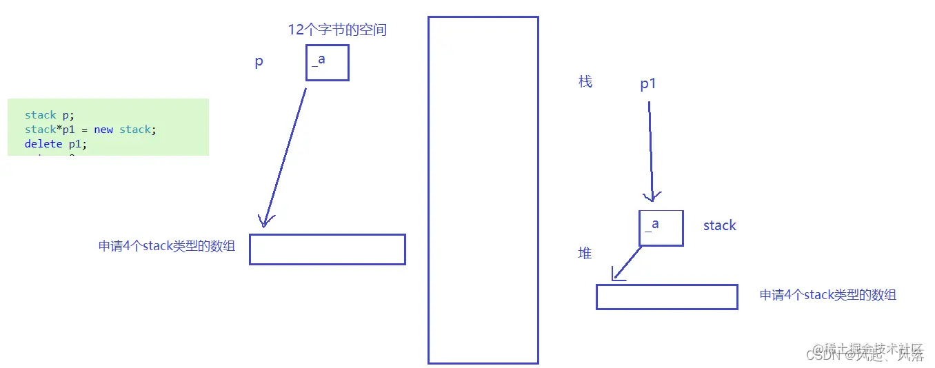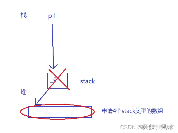 - p1是一个指针,在栈上,指向在堆上申请的一个stack, 再调用构造函数,_a=new stack[4],_a再次指向在堆上申请的4个stack类型的数组, 所以必须先调用析构函数,在释放空间
