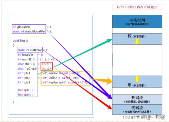 - ptr1 :是一个指向堆开辟空间的指针,处于栈