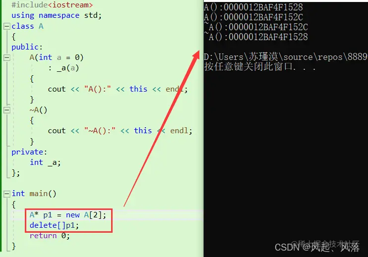 - 申请2个A类型的空间,调用2次构造函数释放空间,并调用2次析构函数