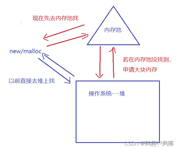 为了提高效率,申请内存去内存池中寻找,而内存池中内存也是堆上的, 如果内存池上有就直接返回,如果没有就会去堆上找,比如需要4个字节,内存池会申请大块的内存,储备到内存池中,下一次来申请内存,就能在内存池中找到