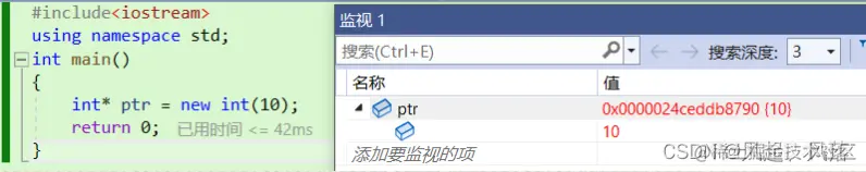 int* ptr = new int(10);//申请10个int的空间并初始化为10