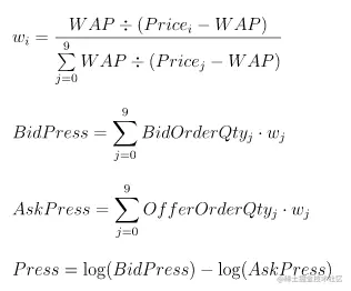 函数名 Press 对应因子名,表示买卖压力指标,BidPrice, BidOrderQty, OfferPrice, OfferOrderQty 表示买卖方向的十档量价,其函数表达式如下: