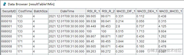 此时可以在 DolphinDB GUI 中执行函数 now(),起到刷新客户端的效果,可以看到右下角变量栏的结果表不断地在更新,查看结果表中的数据,以 1 分钟复杂因子计算结果表为例,具体内容如下: