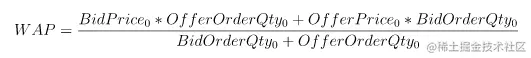 wap = (bidPrice[0]*offerQty[0] + offerPrice[0]*bidQty[0])\(bidQty[0]+offerQty[0])