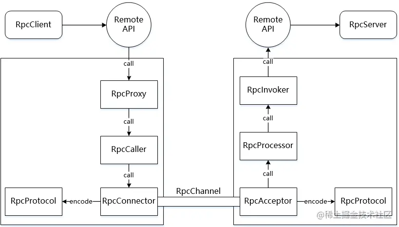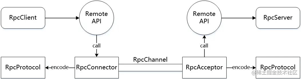 类似地,为了更好地区分 RPC 架构中的角色,我们把真正提供业务服务的组件称为 RpcServer,而把发起真实客户端请求的组件称为 RpcClient。这样,RpcServer 负责实现远程 API,而 RpcClient 负责调用远程 API。