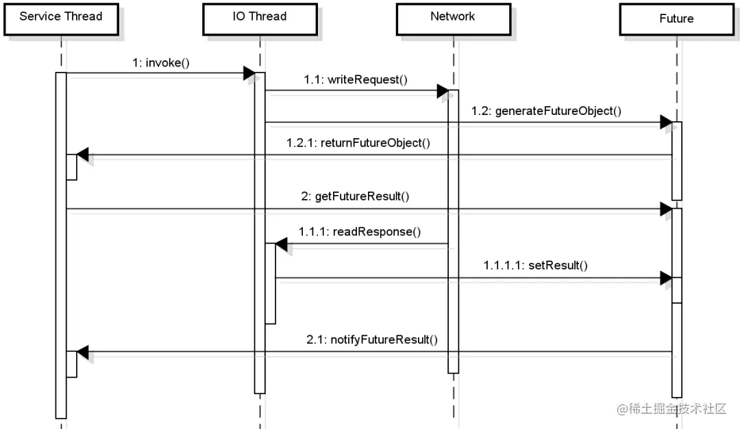 明确了网络通信的基本方式、序列化手段以及所采用的传输协议之后,我们就可以发起真正的远程调用了。RPC 本质也是一种服务调用,而服务调用存在两种基本方式,即单向(One Way)模式和请求应答(Request-Response)模式,前者体现为异步操作,后者一般执行同步操作。
