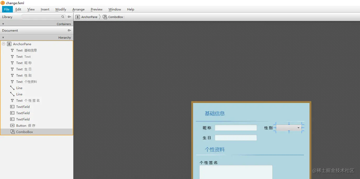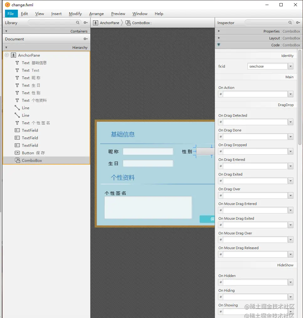 首先在JavaFX Scene Builder 2.0(JavaFX可视化软件)中选择ComboBox控件放在你想要的地方