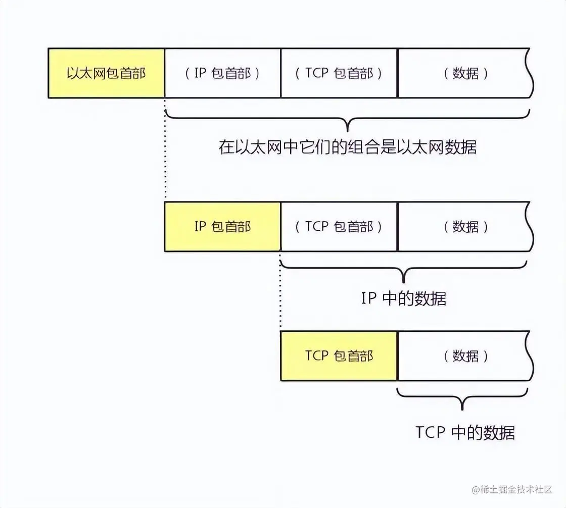 每个分层中,都会对所发送的数据附加一个首部,在这个首部中包含了该层必要的信息,如发送的目标地址以及协议相关信息。通常,为协议提供的信息为包首部,所要发送的内容为数据。在下一层的角度看,从上一层收到的包全部都被认为是本层的数据。