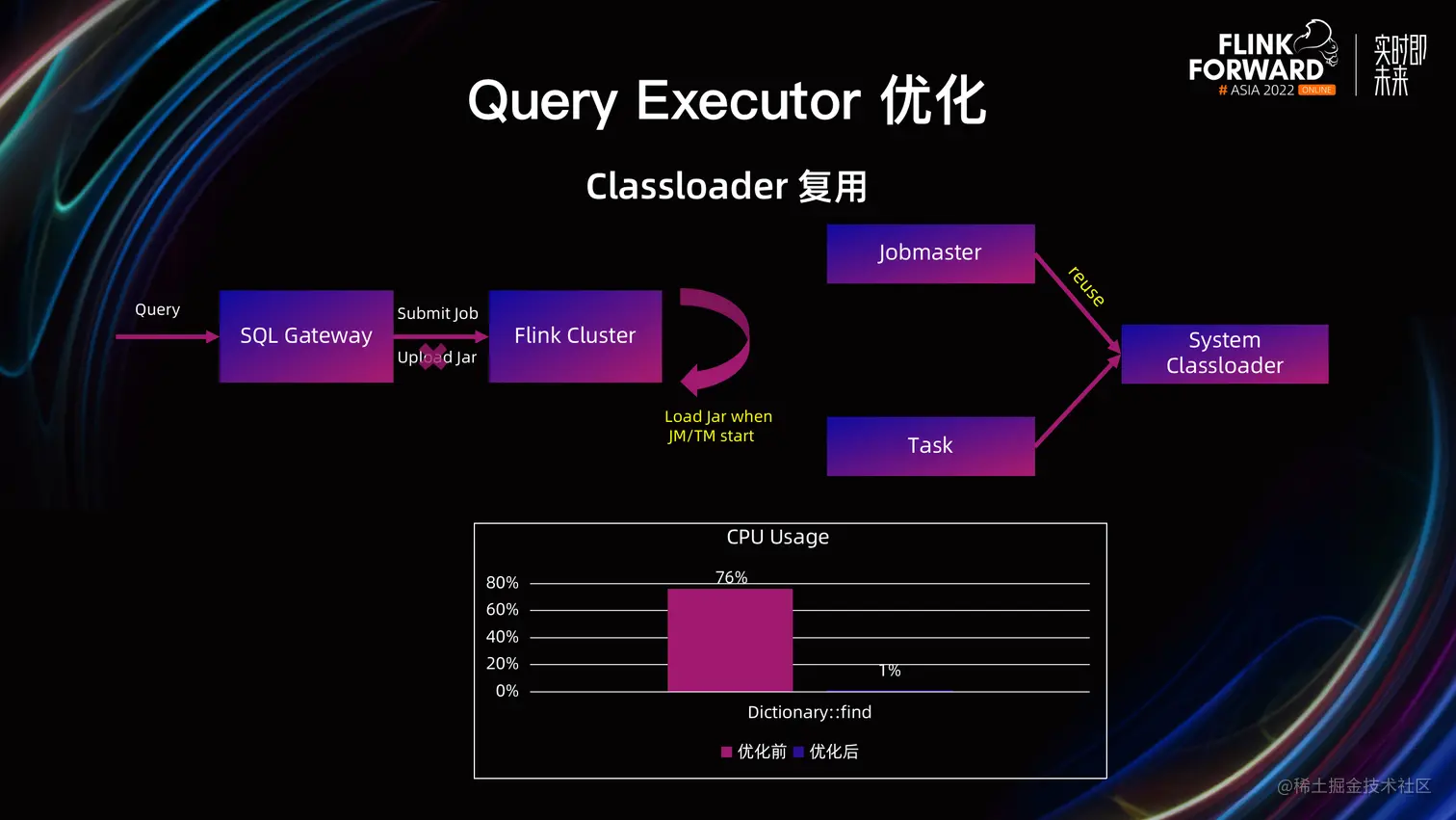 因此支持了 Classloader 复用的优化,分为两步:首先优化依赖 Jar 包的方式,由于 OLAP 场景下依赖的第三方 Jar 包是相对固定的,可以直接放在 JM 和 TM 启动的 Classpath 下,并不需要每个作业单独提交 Jar 包。其次,对于每个作业在 JobMaster 和 Task 初始化时,直接复用 System Classloader。经过优化后,JM 中 Dictionary::find 所占的 CPU 使用从 76% 下降到 1%,同时,Metaspace Full GC 的频率显著降低。