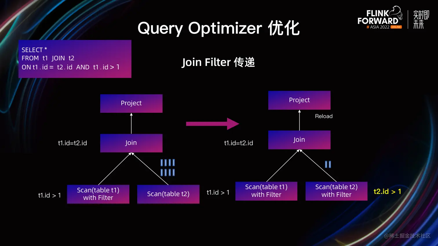 因此支持了 Join Filter 的传递。从上图中可以看出,t1 表的 Filter t1.id > 1,可以通过 Equal 的 Join 条件 t1.id=t2.id,推导出 t2.id>1。因此可以推到 t2 Scan 节点的上游,同时由于支持了 Filter 传递,最终 t2.id>1 会被下推到存储做计算,那么从 t2 的 Scan 节点读取的数据会大幅减少,从而提升查询性能。