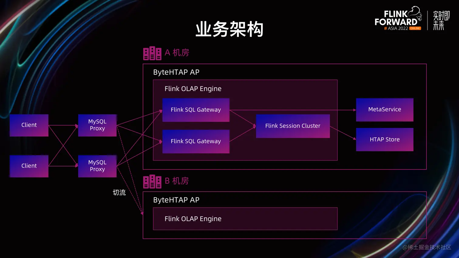 Flink OLAP 是作为内部自研的高性能 HTAP 产品 -- ByteHTAP 的 AP 引擎,用于支持内部的核心业务。通过支持双机房部署提高容灾能力,每个新接入的业务可以在双机房垂直部署两套 AP 集群,在线上集群出现严重故障时,可以通过 Proxy 快速切流到另一个集群,从而提高服务的可用性。