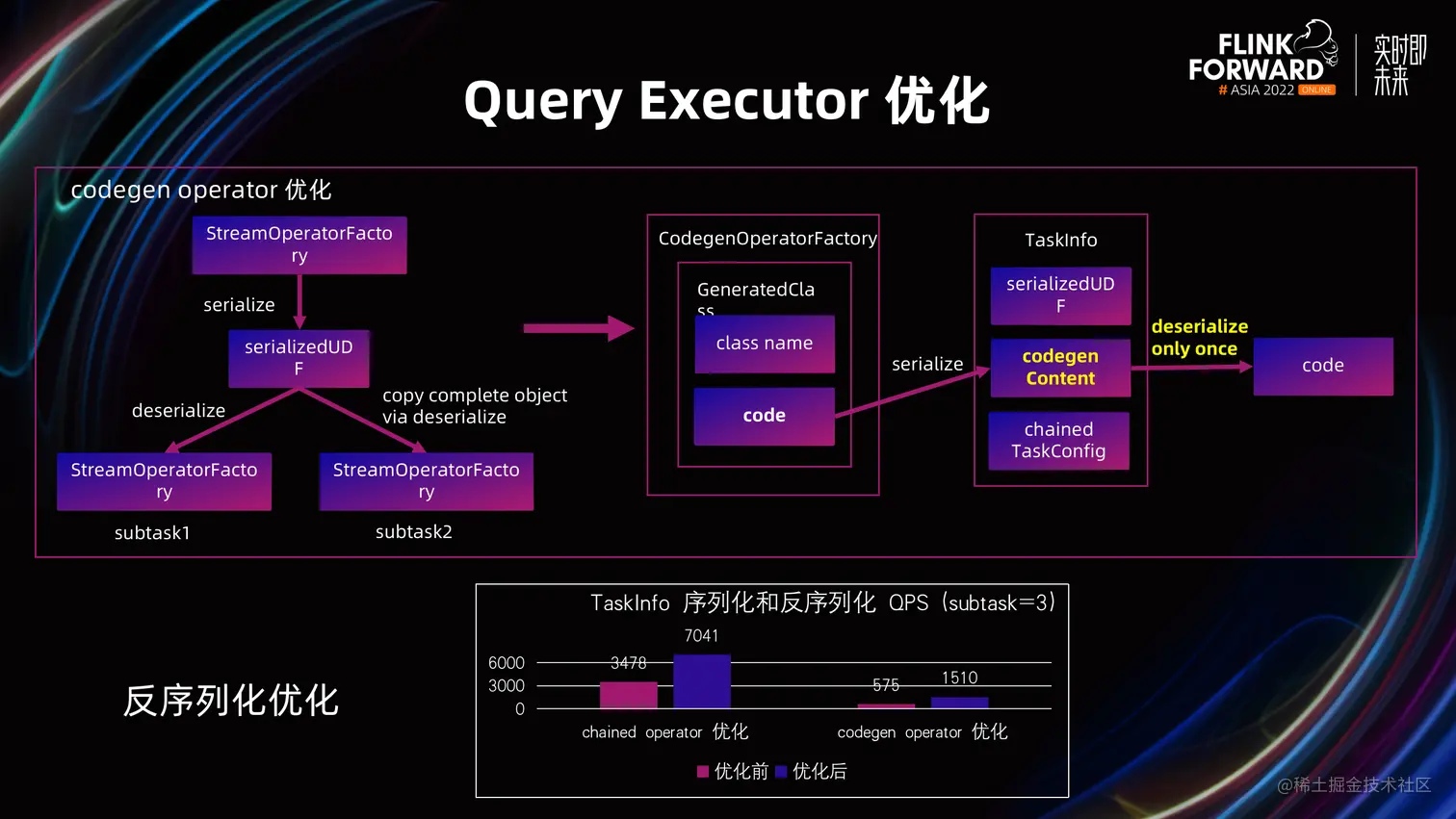 其二是 Codegen 算子的优化。在占比较大的 Codegen 算子在初始化时,也存在较高的反序列化开销。经过分析,该类算子部署信息主要包含 Codegen 源代码,但是一个 TM 上的多个 Subtask 都需要反序列化一遍同样的源代码,存在大量的冗余,因此把 Codegen 源代码拆分出来,单独反序列化一遍后,给所有 Subtask 共享。