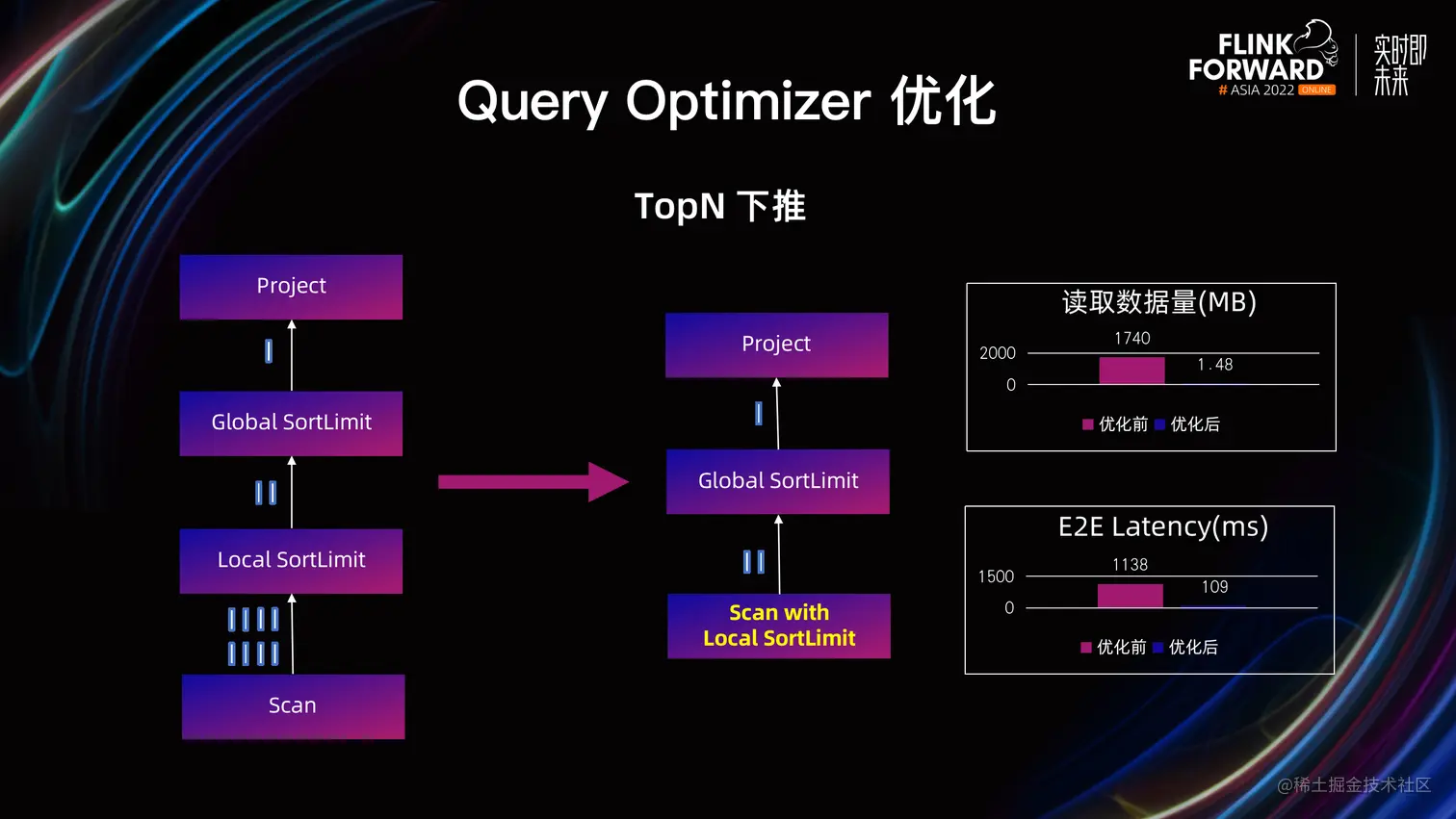 TopN 下推: 在字节内部的一个典型业务上,大部分 Query 都是取 TopN 的数据。通过支持 TopN 的下推优化,把 Local SortLimit 算子,也就是 Local 的 TopN 算子,下推到了 Scan 节点,最终在存储层做 TopN 计算,从而大幅降低从存储读取的数据量。经过优化后,读取数据量降低了 99.9%,业务 Query 的 Latency 降低了 90.4%。 除此之外,也支持了包括 Aggregate、Filter、Limit 等更多的算子下推。
