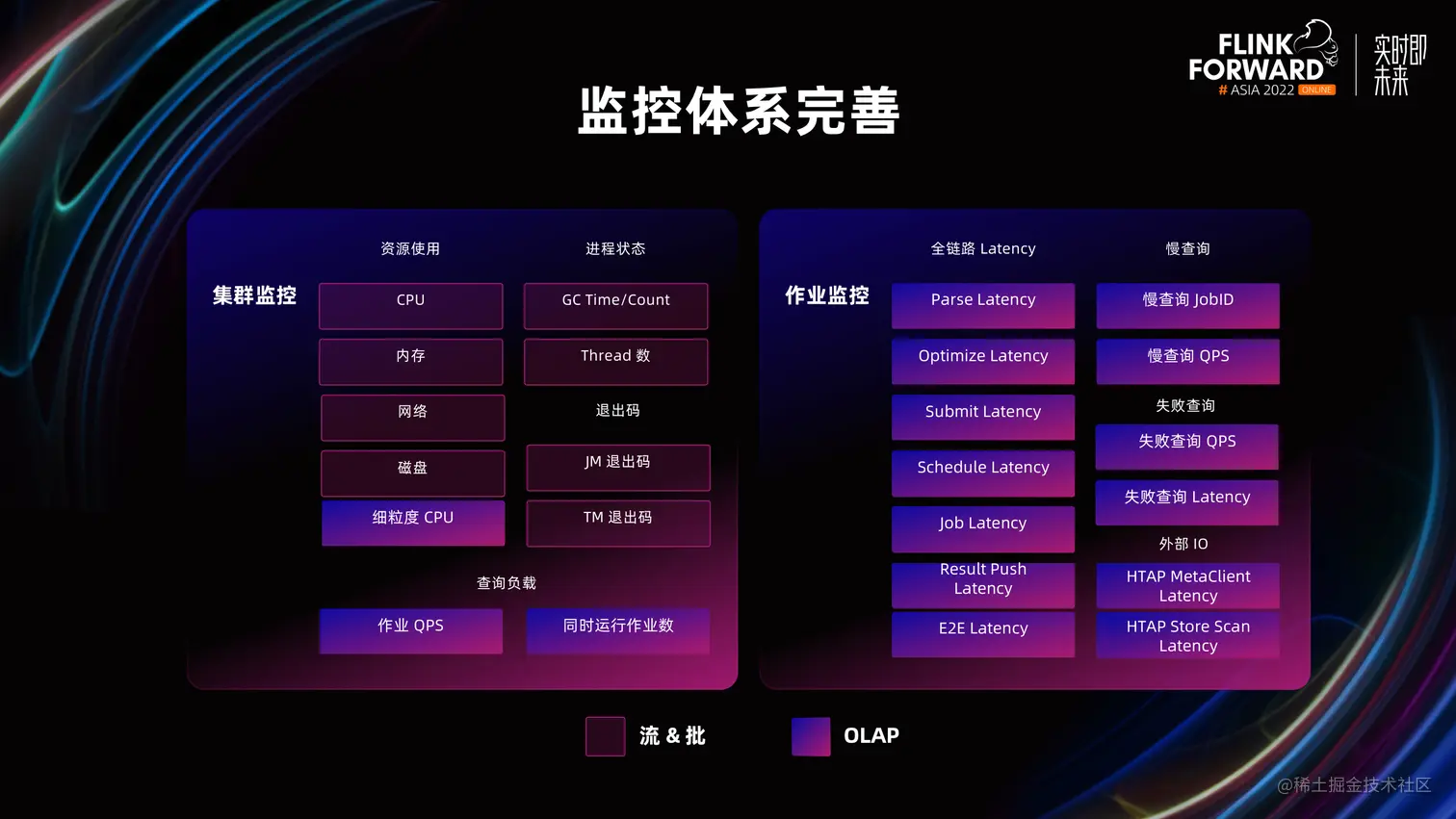 在业务的落地过程中,OLAP 和流批场景有很大的不同,运维、监控和稳定性都需要针对 OLAP 场景单独构建。