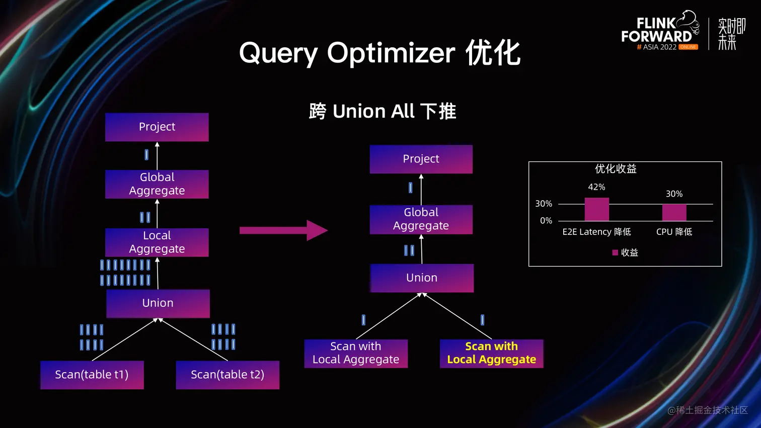 以 Aggregate 为例,从图中可以看出,在优化之前,Union All 节点的下游是一个 Local Aggregate 节点。由于当前 Flink Planner 不支持跨 Union All 的算子下推,导致这里的 Local Aggregate 节点无法下推到 Union All 的上游,也无法进一步下推到 Scan 节点,导致从存储读取了大量的数据。优化之后把 Local Aggregate 节点推到了 Union All 的上游,最终下推到了存储做计算。经过优化后,业务查询的 E2E Latency 降低 42%,Flink 集群的 CPU 消耗降低 30%。