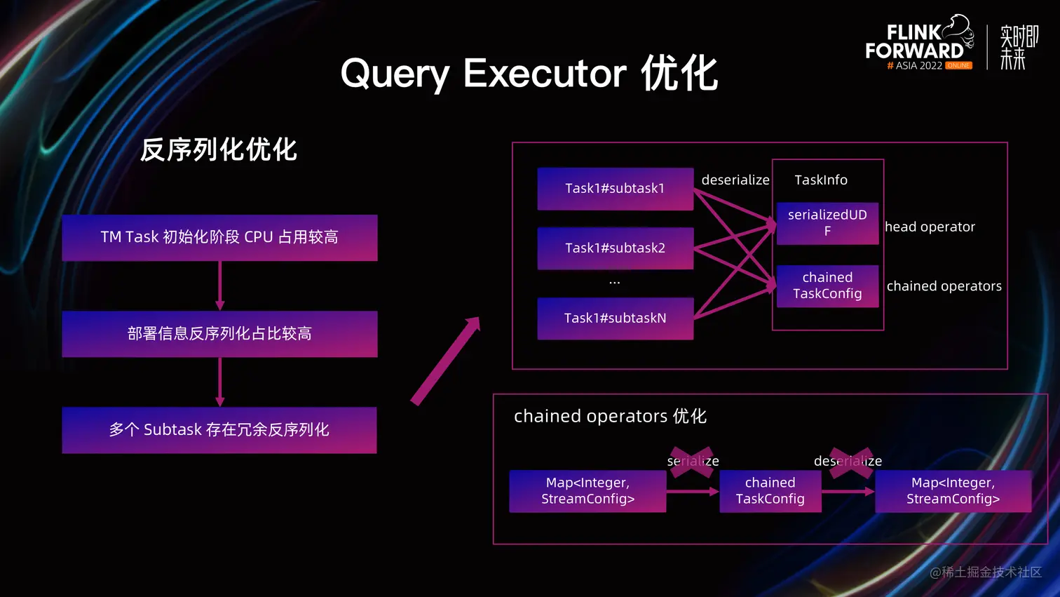 其一是 Chained Operators 的嵌套序列化结构,主要是去掉对 Map 结构不必要的序列化和反序列化,使得同一 Task 的多个 Subtask 可以复用同一个反序列化后的 Map。