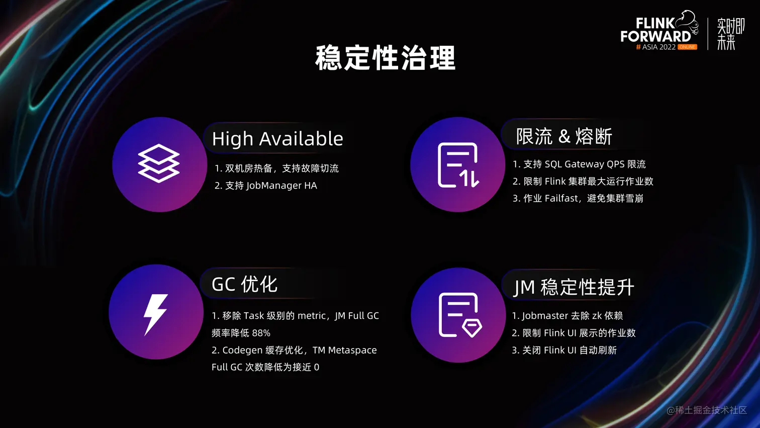 Flink OLAP 作为在线服务对稳定性要求很高,但是在落地初期,由于服务缺乏容灾、JM / TM FGC 频繁等问题,线上稳定性较差。我们分别从 HA、限流、GC 优化和 JM 稳定性提升四个方面进行治理。