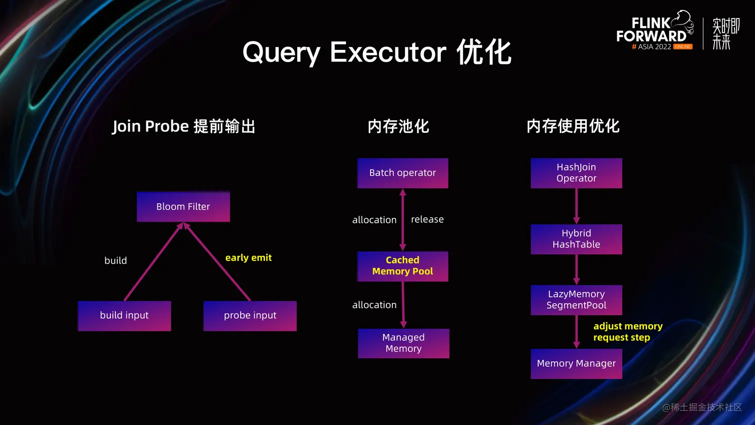 - 内存池化:在算子启动的时候,从 Managed Memory 申请内存,并初始化内存分片。在 OLAP 场景下,这部分的时间和资源消耗占比较大,因此支持了 Cached Memory Pool,即在 TM 维度内共享内存池,而不需要在算子启动的时候初始化内存。