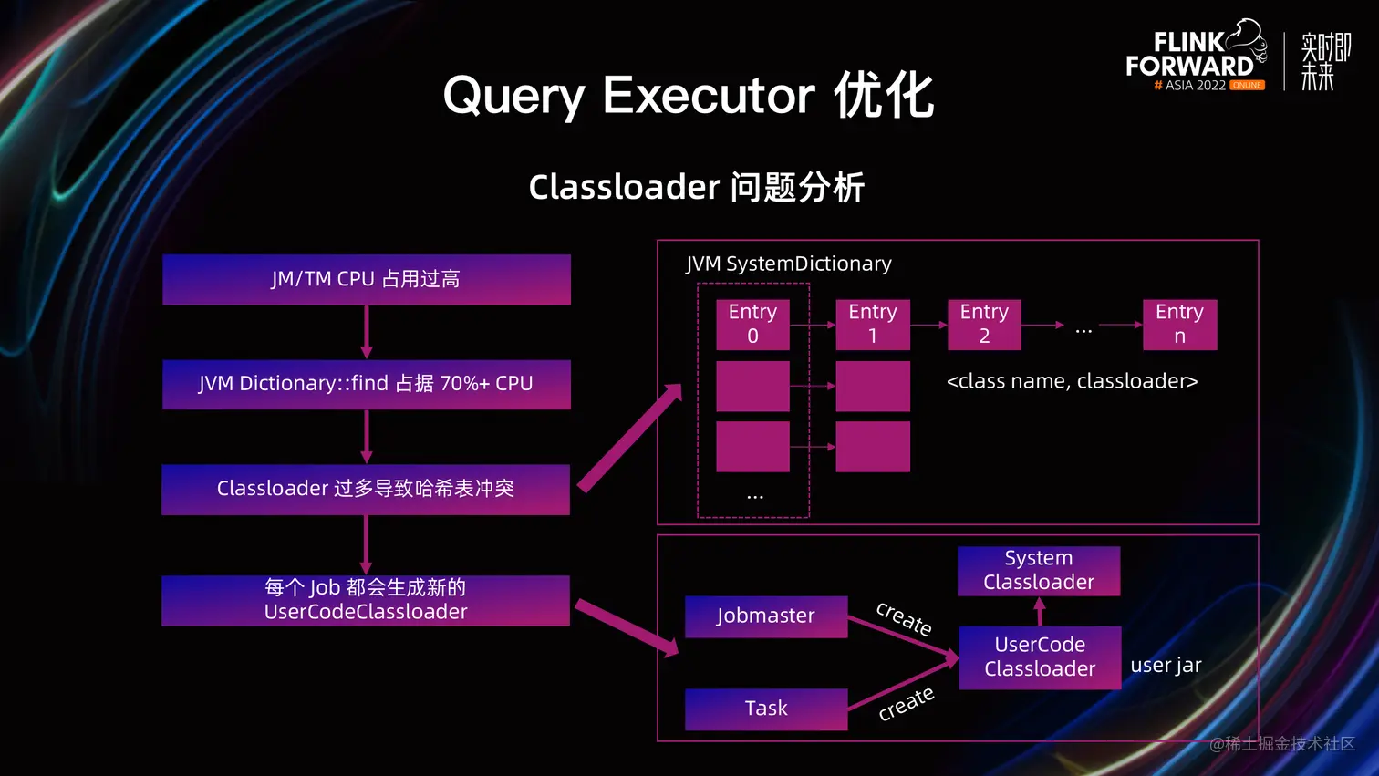 在线上集群持续运行的过程中,我们发现了JM / TM 进程频繁创建 Classloader,导致 CPU 占用过高的问题。通过火焰图分析,JVM Dictionary::find 占据了 70% 以上的 CPU,进一步分析 JVM 源码发现,JVM 在加载了 class 之后,为了加速从 class name 到 Classloader 的查找,会维护一个名叫 SystemDictionary 的哈希表。在 Classloader 数量非常多的时候,哈希表中存在大量的冲突,导致查找过程非常缓慢,同时整个 JM 大部分的 CPU 都消耗在这个步骤。