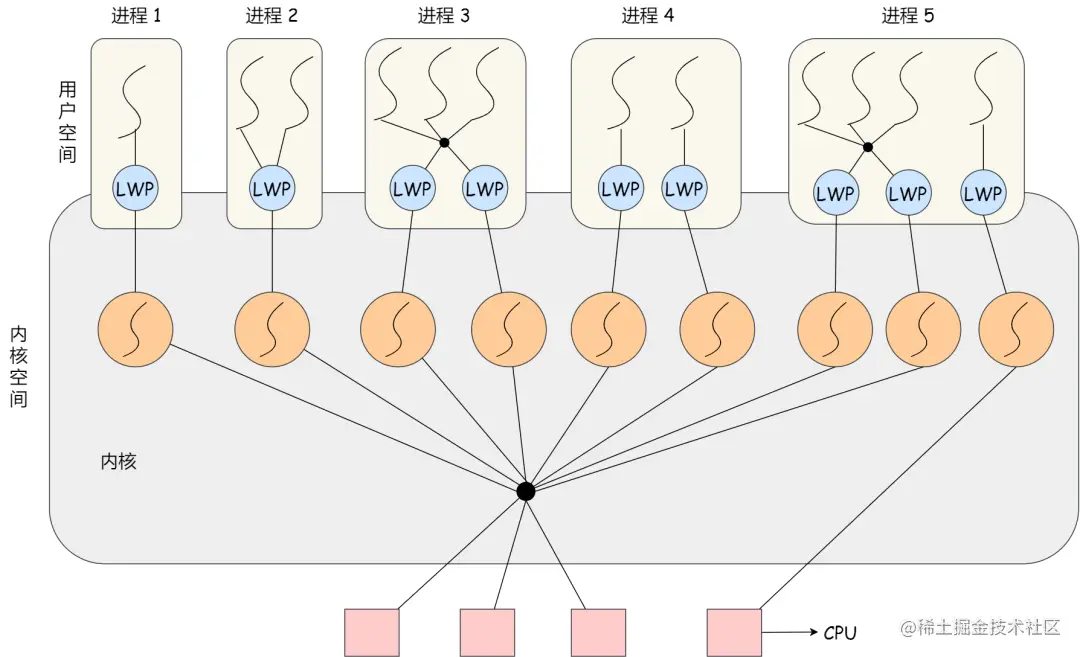 一个进程可有一个或多个 LWP,每个 LWP 是跟内核线程一对一映射的