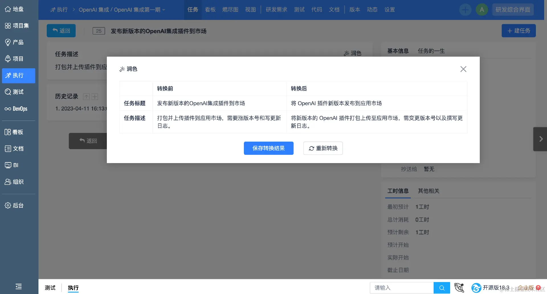 昨日我们发布了包含 ChatGPT 聊天框(神奇海螺)和需求润色功能的禅道 OpenAI 插件 1.0 版本,广受大家欢迎。今天,最新版本 1.1 发布,新增任务和 Bug 的润色功能,还修复了权限及图片展示的问题,大家可以更方便、更顺畅地使用 OpenAI 插件啦!