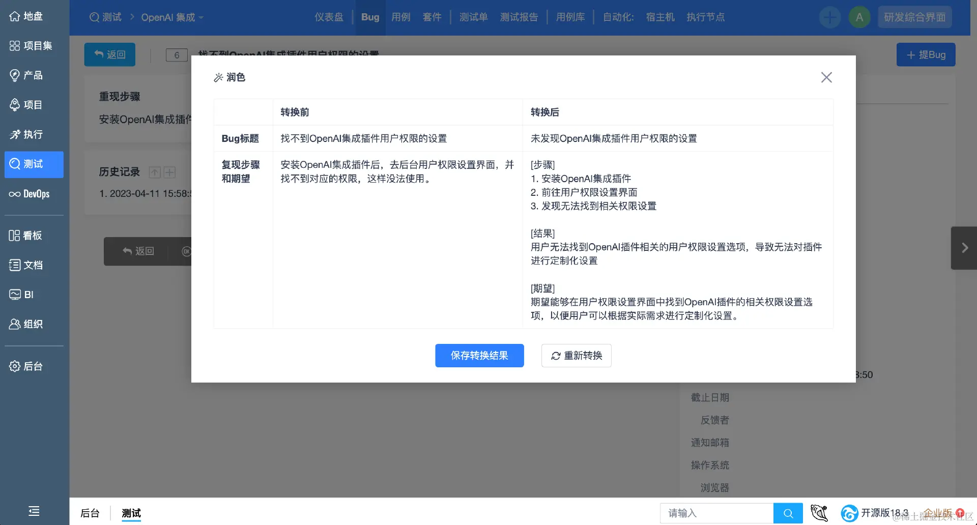 - 可以根据转换后的内容再度调整原有 Bug 描述、复现步骤和期望,重新转换。