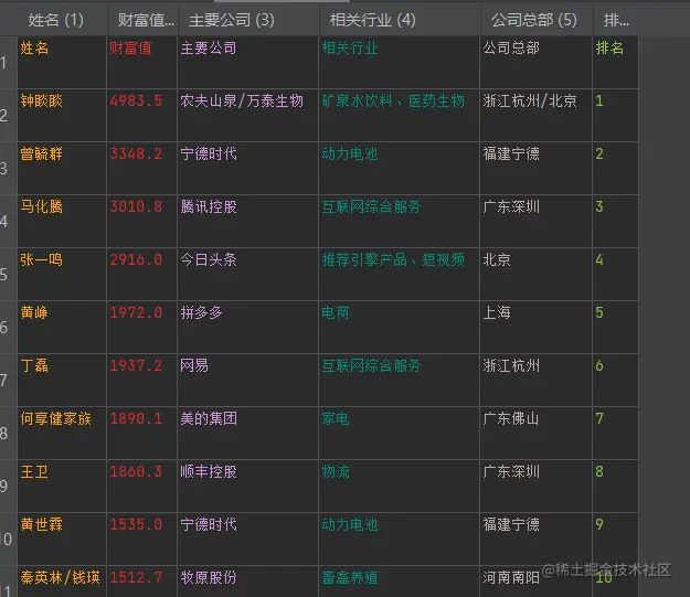 csv_writer = csv.DictWriter(f,fieldnames=['姓名','财富值','主要公司','相关行业','公司总部','排名'])