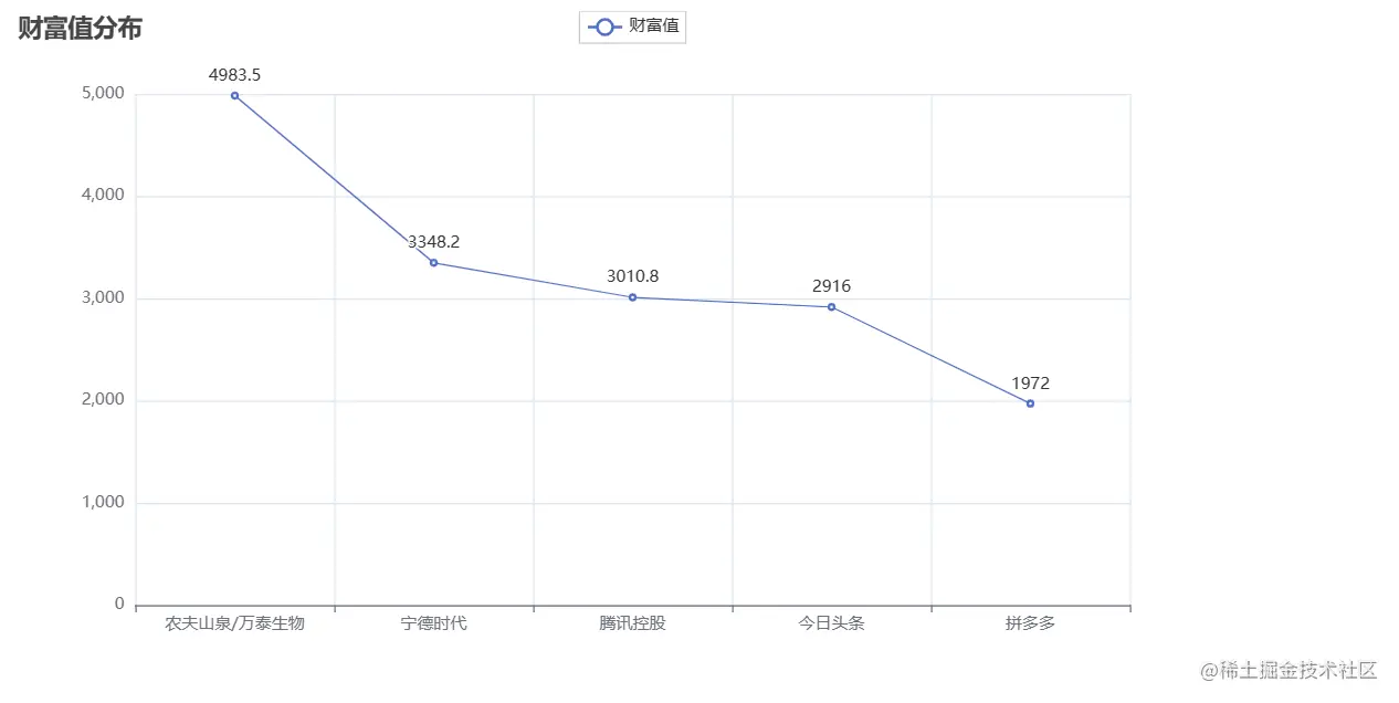 这段代码中,我们使用 Pandas 库的 read_csv() 函数读取了一个名为 "财富榜.csv" 的 CSV 文件,并将其存储在 df 变量中。然后,我们使用 Line() 函数创建了一个新的 DataFrame 对象,并使用 add_xaxis() 方法将 x 列添加到 DataFrame 中。接着,我们使用 add_yaxis() 方法将 DataFrame 中的 "财富值" 列添加到 DataFrame 的 "财富值" 列中。最后,我们使用 set_global_opts() 方法设置了 DataFrame 的标题选项,并使用 title_opts 参数设置了标题。
