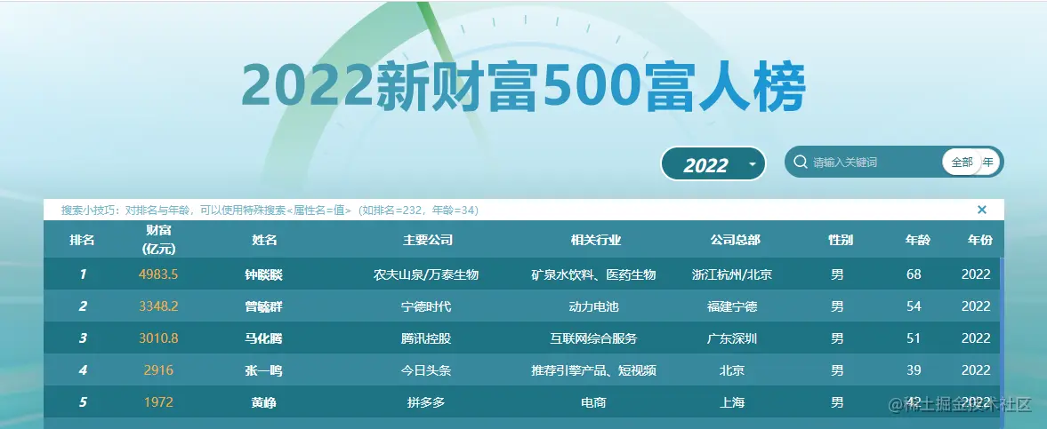 首先,我们对目标网址进行数据采集。我们可以清楚的看到,在2022年中新财富500富人榜。