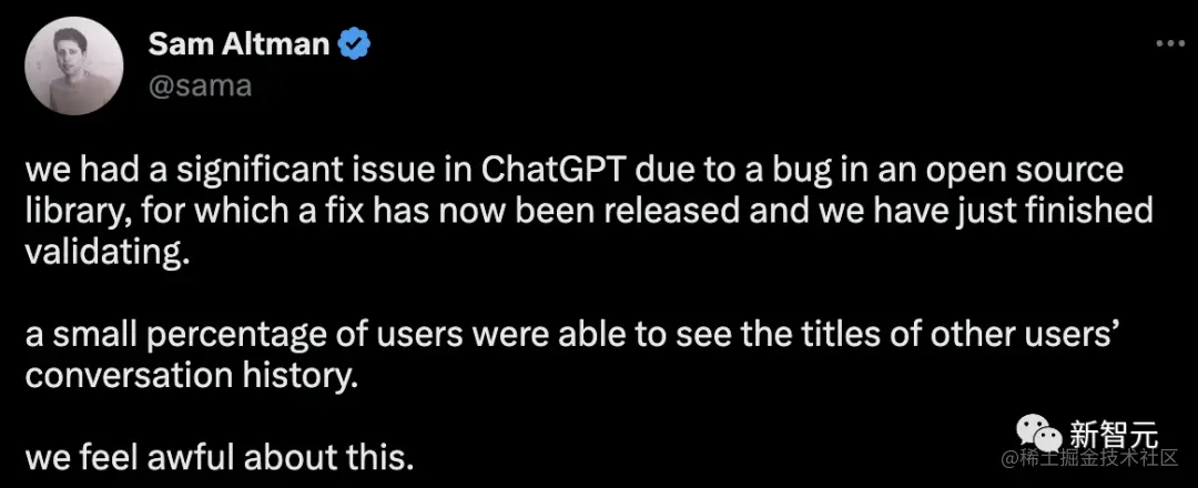 当时 Sam Altman 不得不亲自出面,在推特上解释,bug 问题源于开源代码库中存在的一个错误,最终导致 ChatGPT 聊天历史泄露。