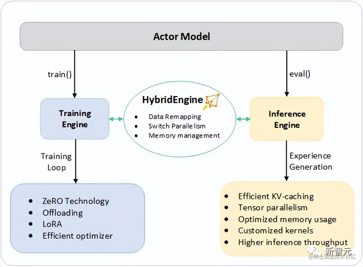 每个迭代都需要有效地处理两个阶段:a)推理阶段,用于 token / 经验的生成,产生训练的输入;b)训练阶段,更新 actor 和 reward 模型的权重,以及它们之间的互动和调度。