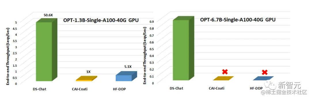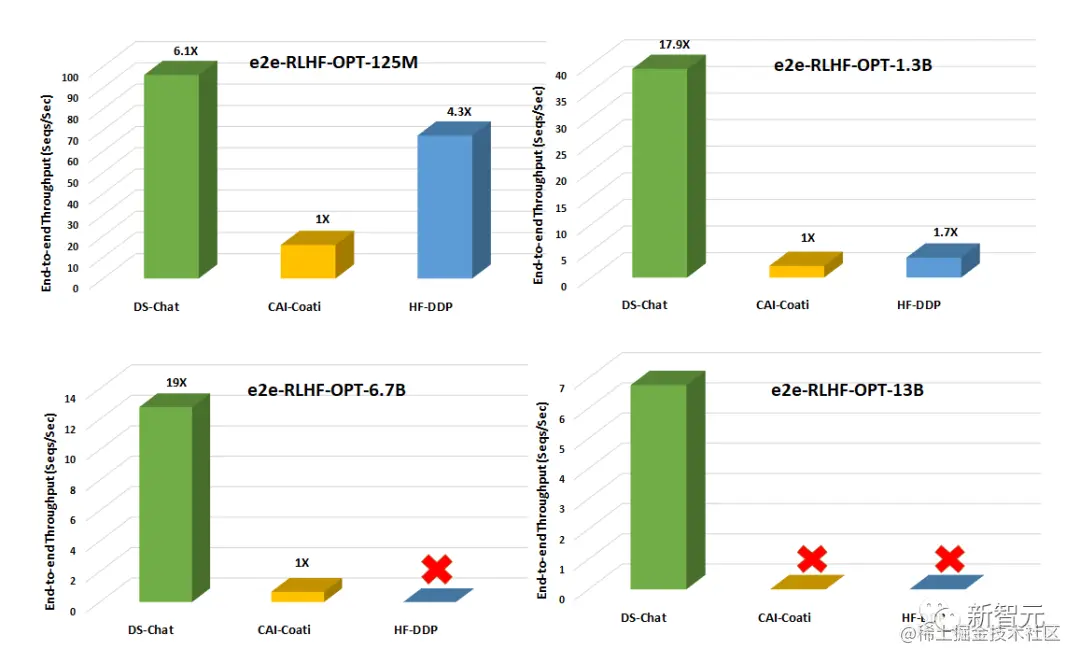 在单个节点的多个 GPU 上,DeepSpeed-Chat 在系统吞吐量方面比 CAI-Coati 提速 6-19 倍,HF-DDP 提速 1.4-10.5 倍。