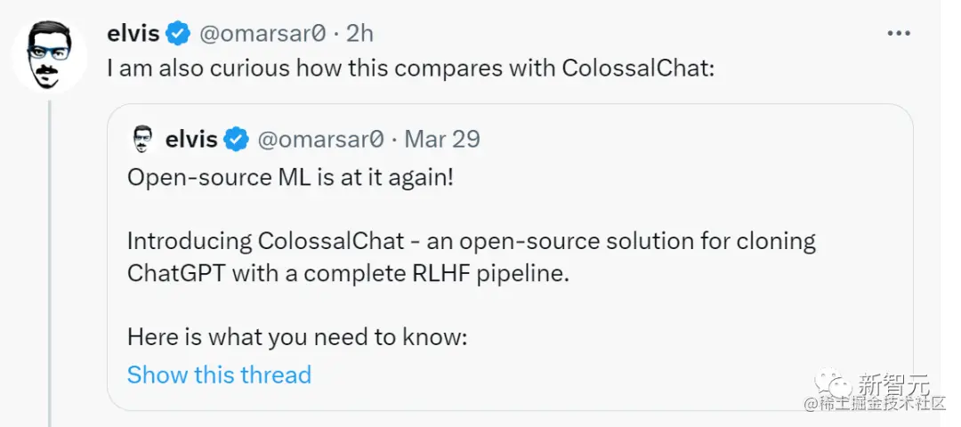 前 Meta AI 专家 Elvis 激动转发,称这是一件大事,并表示好奇 DeepSpeed Chat 和 ColossalChat 相比起来如何。