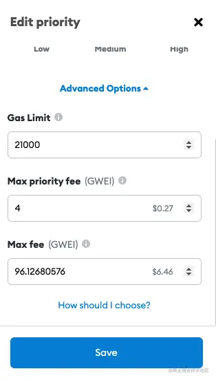 默认情况下,MetaMask的10.0.0版本会自动设置交易的最高优先费用。您可以用"编辑 "按钮修改这些费用,可以选择低(确认速度最慢)、中或高(确认速度最快)费用。