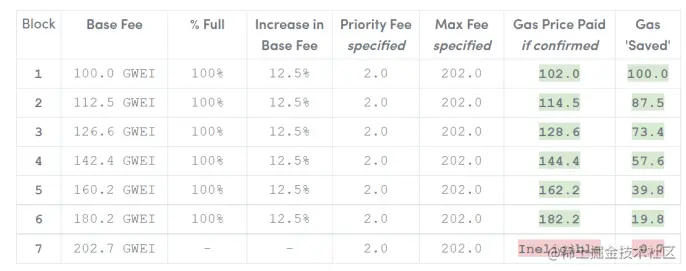 - 如果你的交易在第6区块之前都没有被确认,那么在第7区块期间,它将变得不可处理--它不再是一个候选者,因为它的最高费用202.0 GWEI刚好低于了新的基础费用202.7 GWEI。